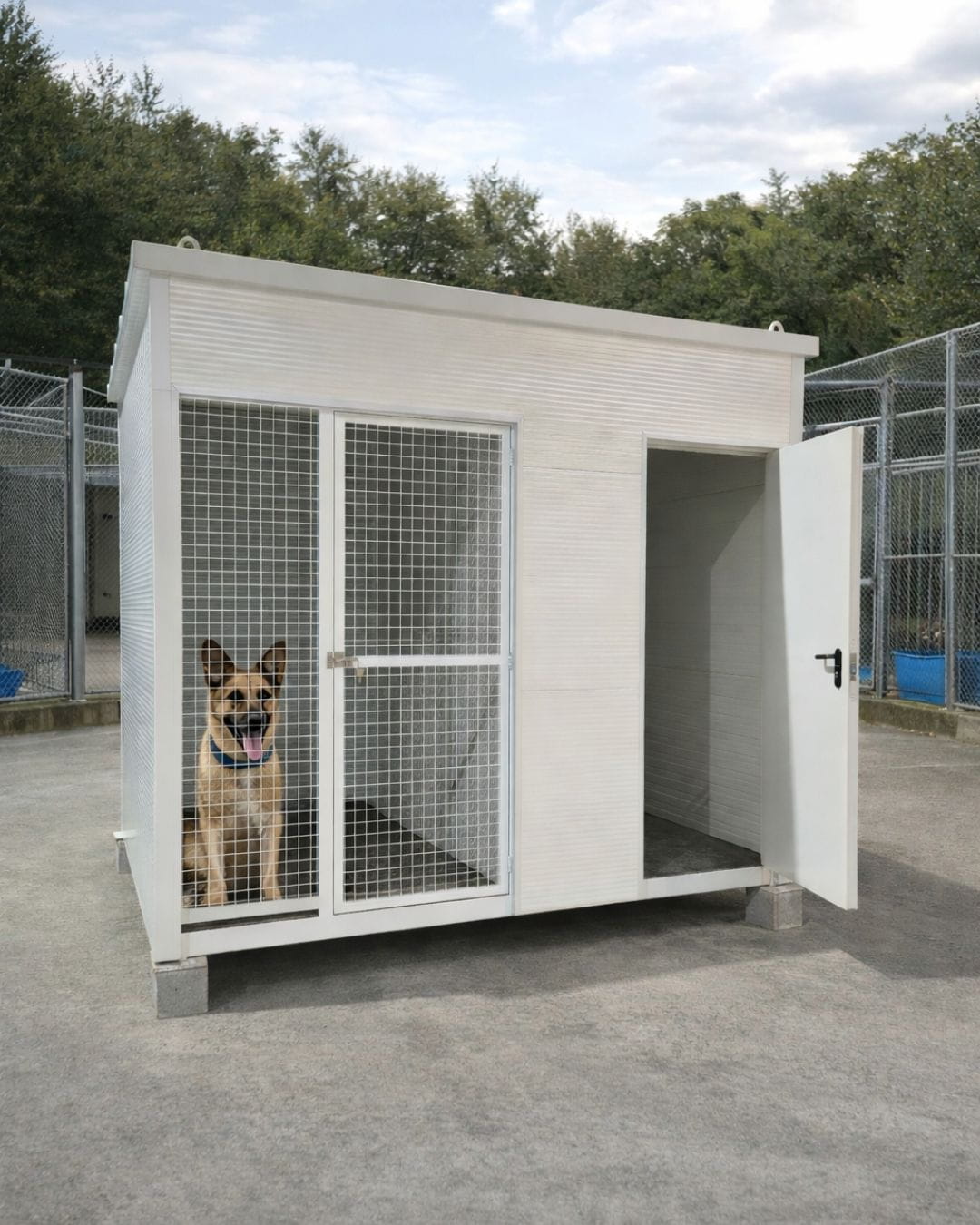 Resultado: Ponemos a disposición de la Mancomunidad de Ayuntamientos de la Comarca de Ferrol un canil, con zona externa e interna, para el confort y salubridad del animal. De gran resistencia, esta estructura modular cuenta con todos los requerimientos para la estancia de un perro o gato y recoge todos los requerimientos de la Nueva Ley de Bienestar Animal.